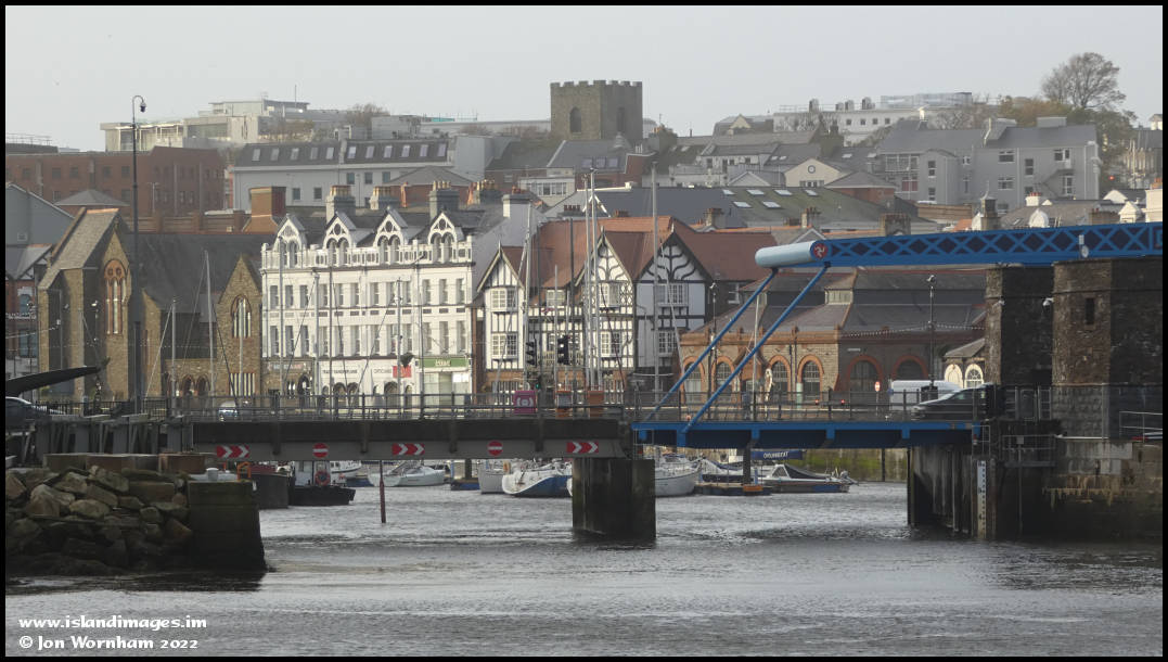 Using a fairly small amount of the 60x zoom available on the FZ82 (170 mm equivalent) to look past the lifting bridge to the North Quay area of Douglas.