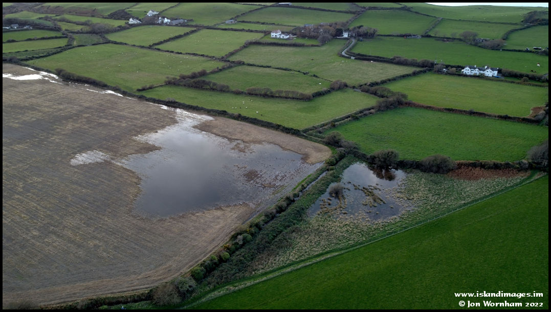 Climbing higher to look down on where the stream has overflowed into fields on either side. Fortunately the footpath hugs the field boundary to the lower edge of the picture and wasn't affected.