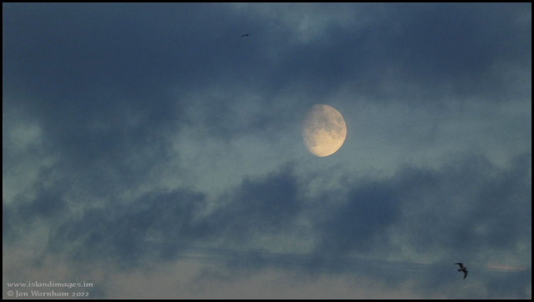 Clouds scud past an almost full moon, as it rises over the town.