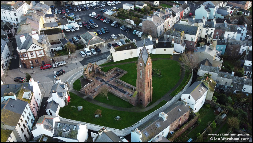 St Peter's Church. Probably originally constructed in 1550, but maybe earlier, rebuilt twice afterwads due to fires. The clock tower dates from 1872. After a final fire in 1958 most of it was demolished, just leaving the tower and some low walls.