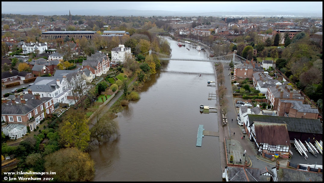 Looking downstream towards the suspension bridge. Rowing is a big activity on the river here, one of the school boathouses can be seen on the right with a boat close to the bridge.