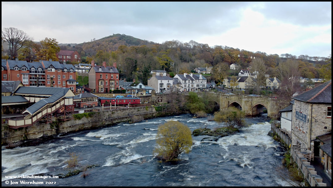 Moving out over the river, there's a lot of water coming down after recent rains. The railway station is the terminus of the
