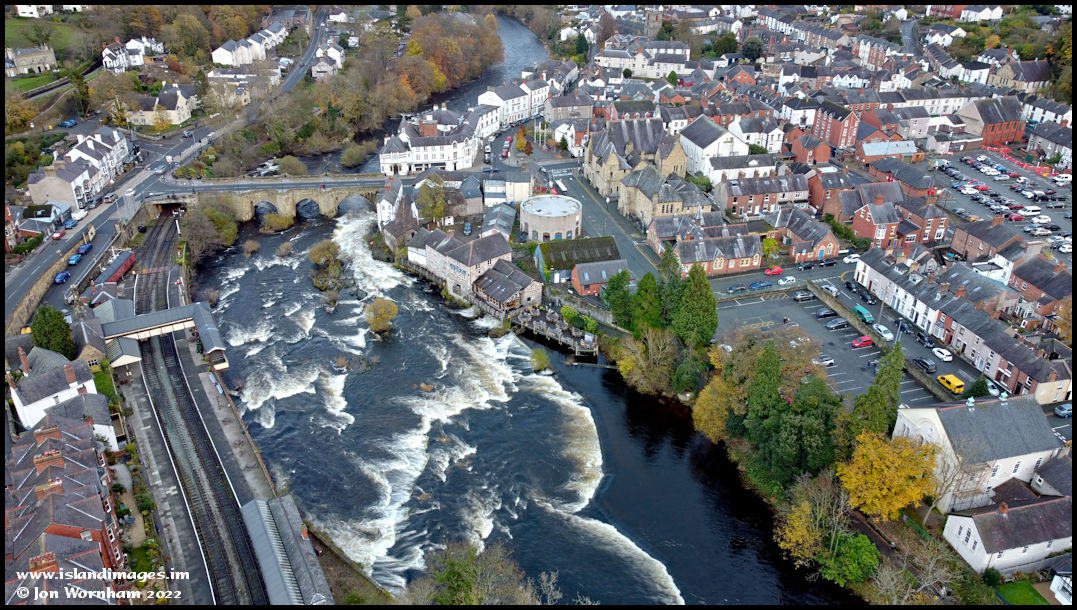 A semi vertical view looking down on the weir and rapids of the River Dee in the town. It's a popular spot for white water kayaks and international competitions are held here.