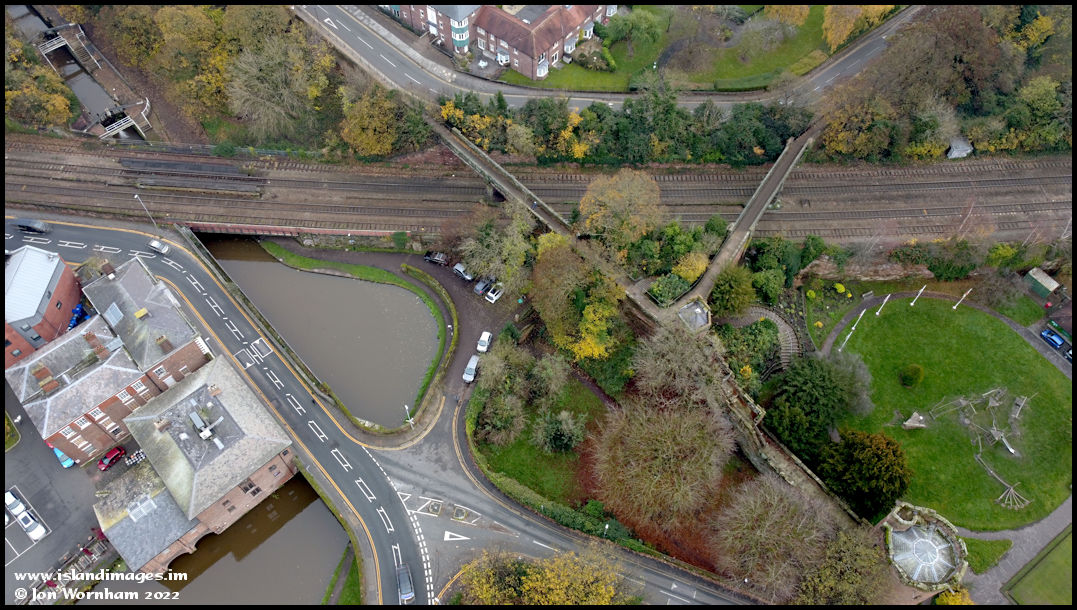 A vertical view showing how road, railway and canal interact, with the Chester city walls forming a 'V' shape over the railway tracks.