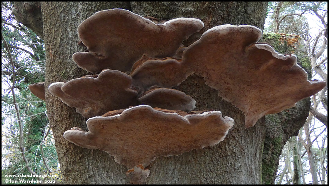 Some amazing giant bracket fungi growing on a dead tree.