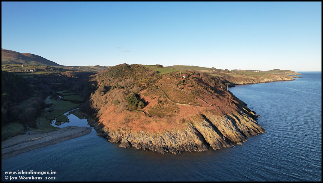 The northern headland with an old coastguard lookout, Maughold Head in the distance on the right.