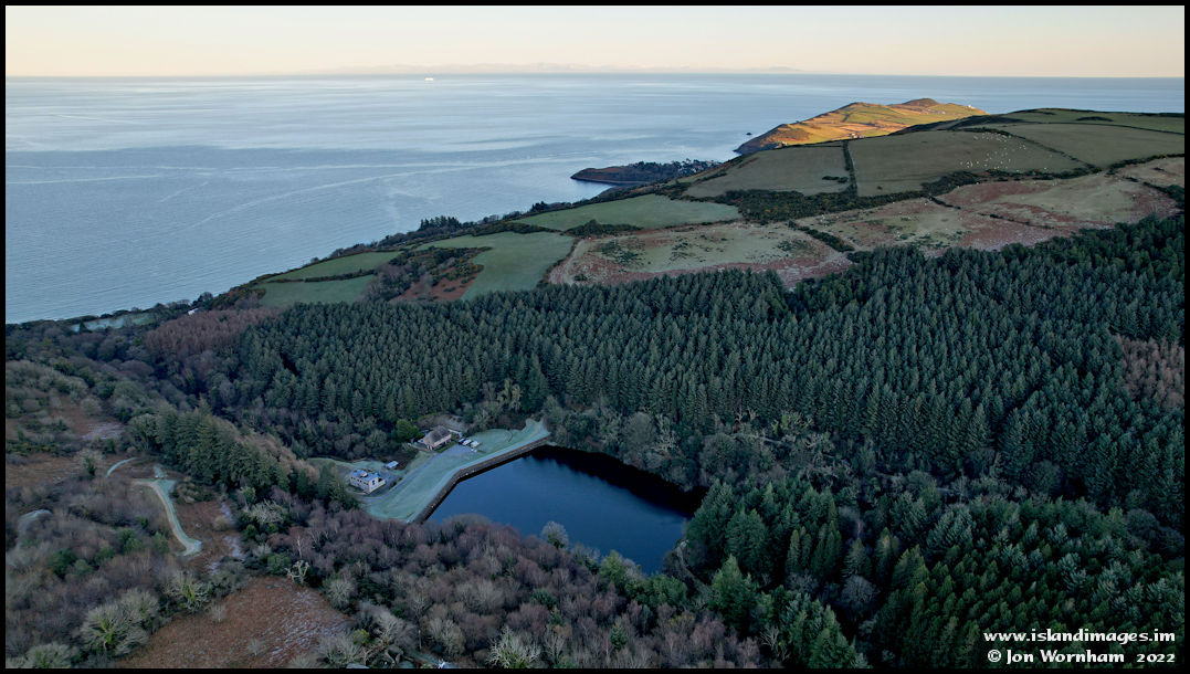 Ballure Reservoir, hiding in the plantation. Sunlight still on Maughold Head and the Cumbrian Mountains in England just visible on the horizon.
