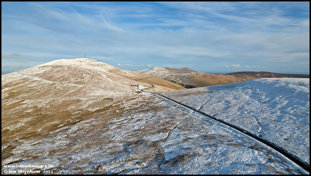 Looking along the Mountain Road to the Bungalow and Snaefell, with North Barrule in the distance.