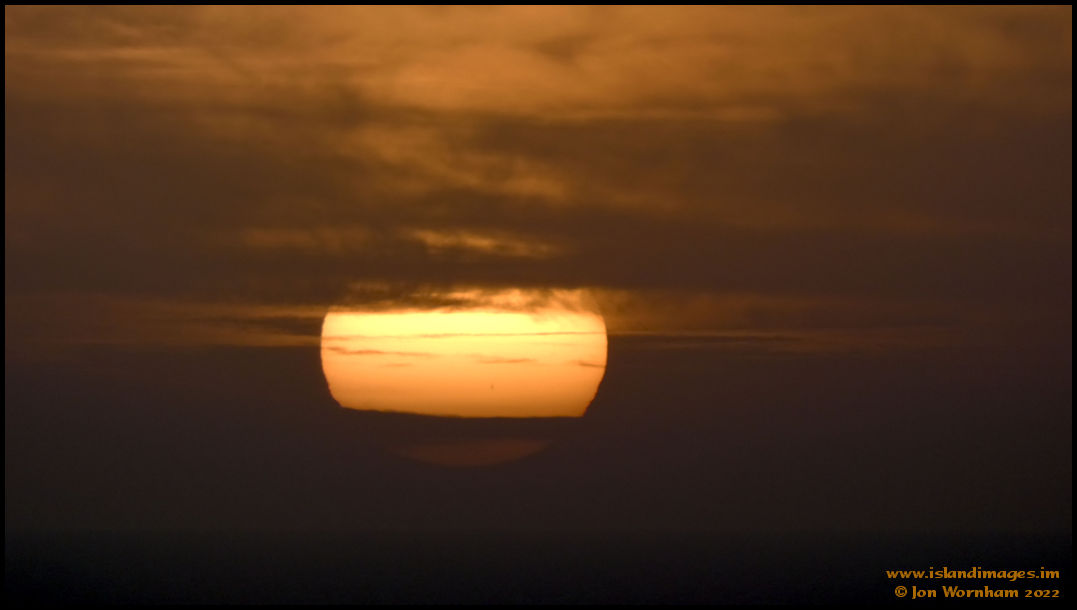 The sun between to bands of cloud, it's a fairly hazy day so the horizon isn't that well defined.