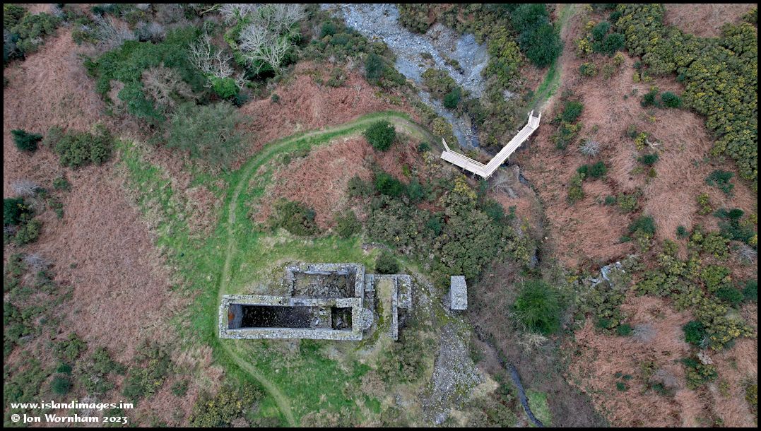 A vertical view looking down on the old water wheel case and brand new footbridge.