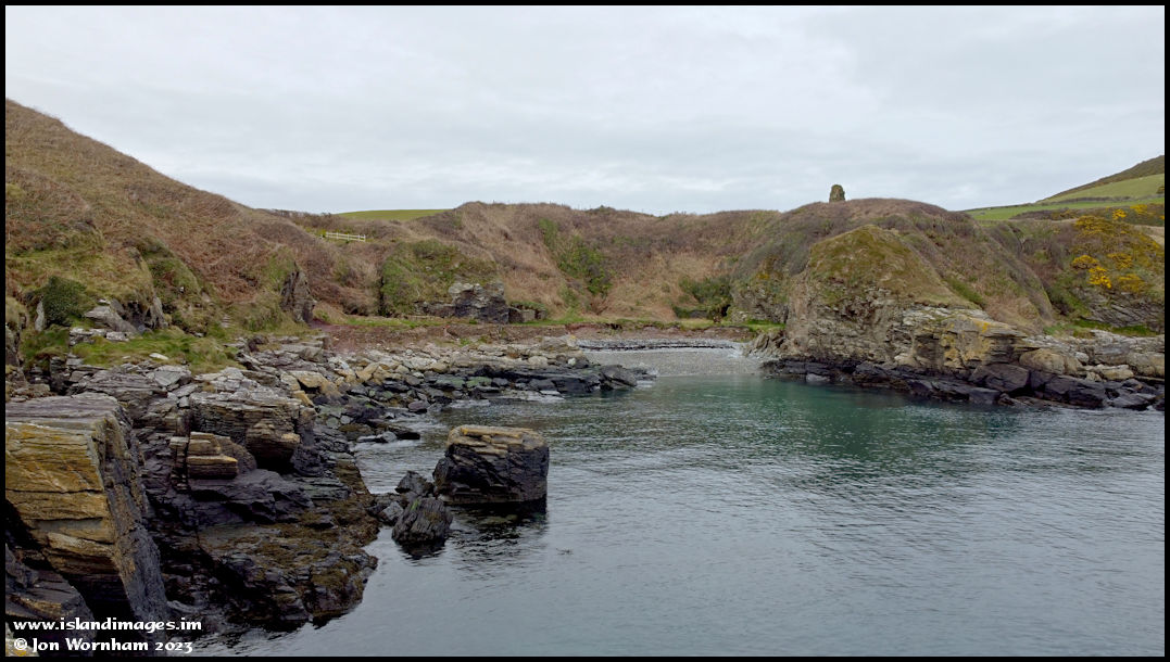 Low over the sea and looking to the Maughold village beach. I think the structure on the clifftop was a chimney for the lime kiln that was on the beach here.
