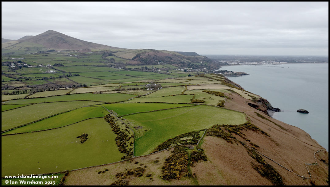 The Brooghs and farmland near Maughold, with North Barrule and Ramsey in the distance.