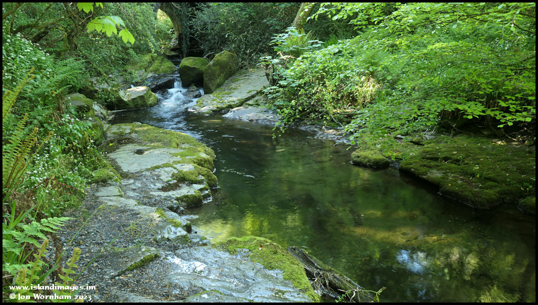 We've dropped down to river level here and this little waterfall and pool is by where the Cornaa River is crossed by the Manx Electric Railway on a high bridge.