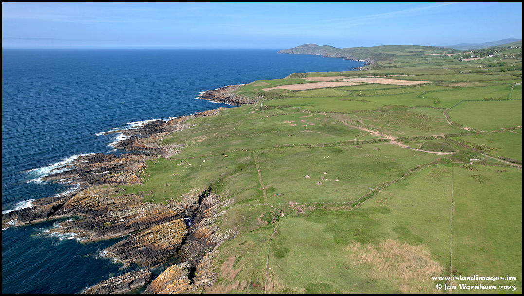 Famland to the north of Niarbyl.  During WW2 this was the site of the Dalby 'Chain Home' radar station, the supports for one of the masts can be seen towards the centre of the picture, with two grass covered bunkers on the right.