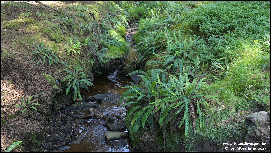 This was the picture I had been aiming to take, with the little stream bubbling its way between fern lined banks. Eventually this water will drain out to sea at Peel.