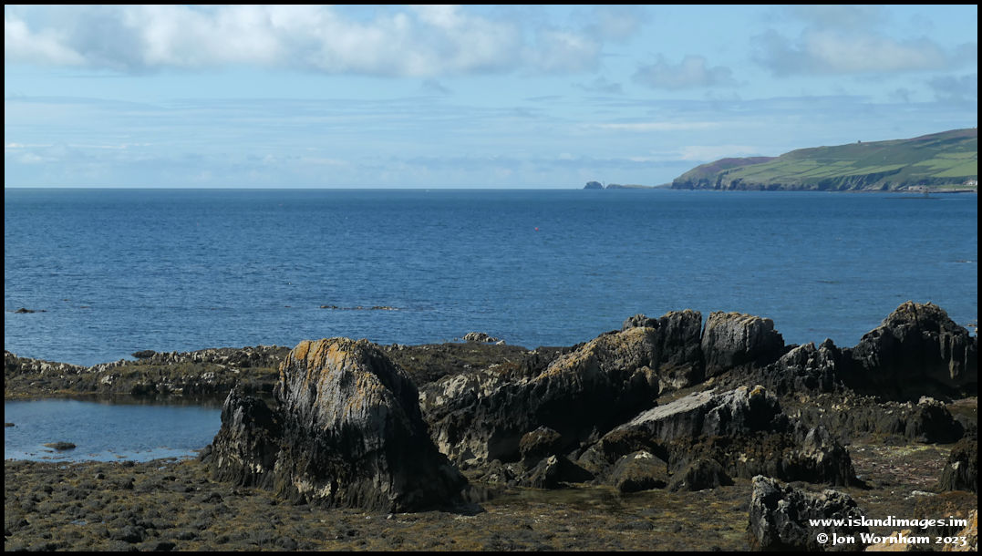 Rocks at Pooilvaaish, then across the bay to The Chasms and the Calf of Man, with the Chicken Rock lighthouse jusr about visible.