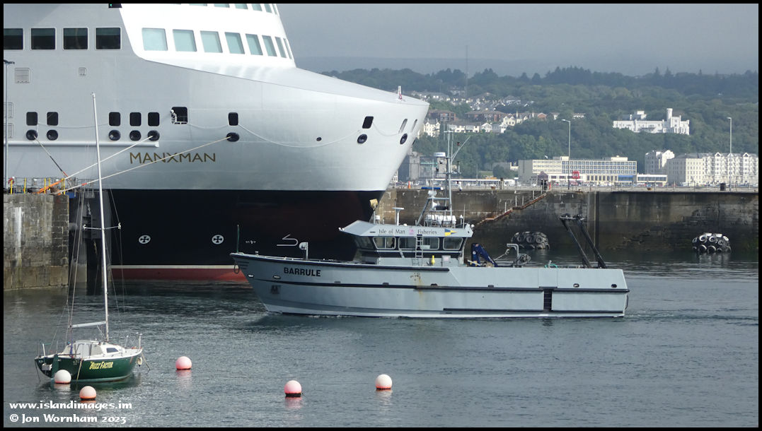 'The Manx Navy'. Fisheries protection vessel 'Barrule' crosses the harbour with the Steam Packet's 'Manxman' as a backdrop.