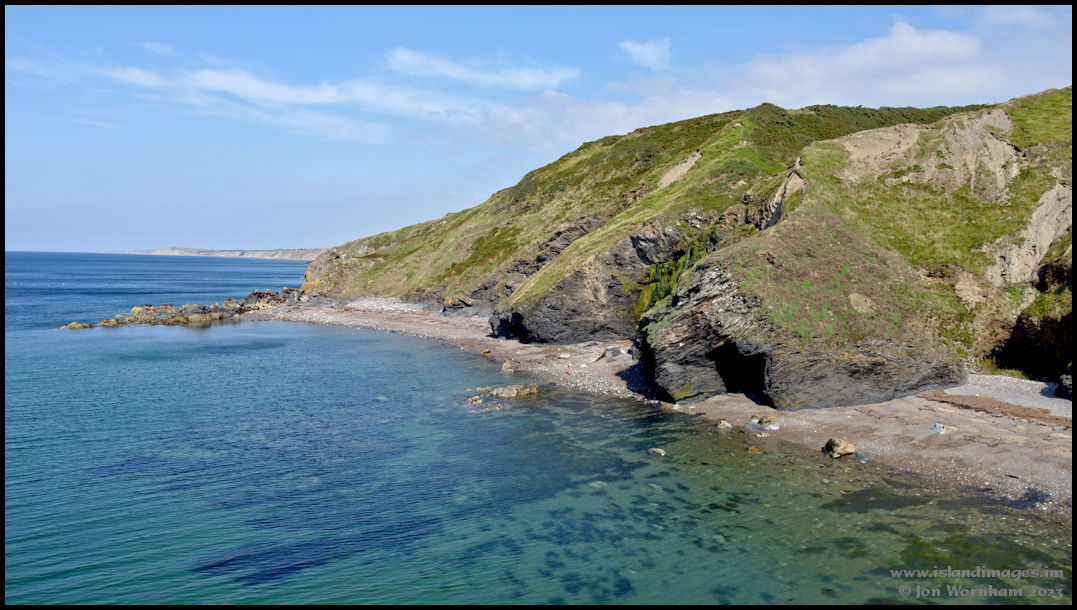 Dropping back lower again to take a look at the headland with cave that divides the two beaches.