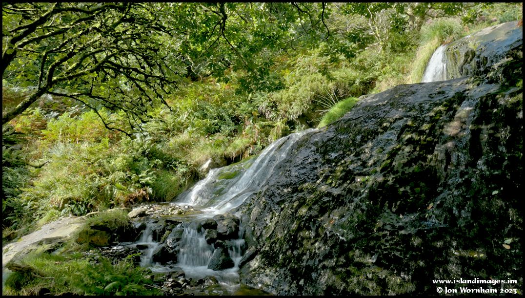 A side on view of the waterfall. In the winter, water will often be rushing over the rock on the right as well.