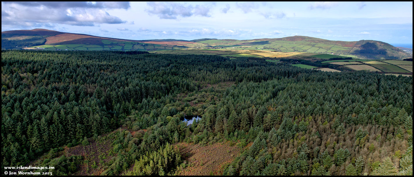 Overhead Archallagan Plantation. In the distance is South Barrule on the left and Slieau Whallian on the right.