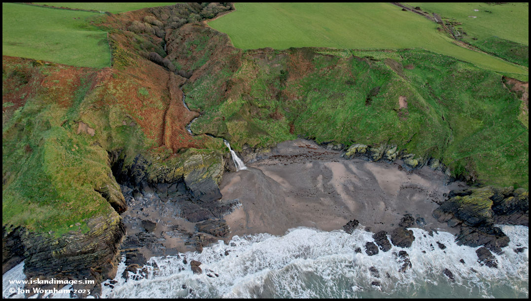 Turning the camera around I noticed this beach, complete with waterfall! I think that this is Ballanayre Strand, but it looks fairly unreachable at ground level, apart from by sea.