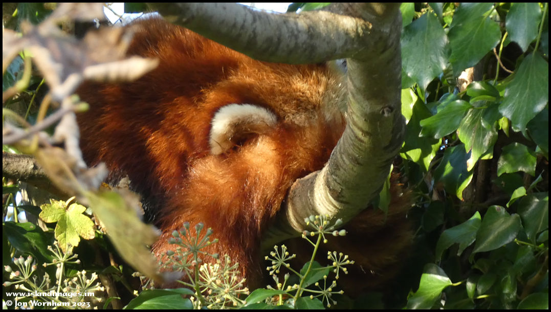 One of the Red Pandas engaged in a favourite occupation - sleeping in the trees. Its tail is wrapped over its face, that's a ear sticking out!