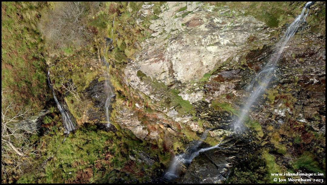 Dropping the drone down below the rim of the quarry to reveal that there are in fact three waterfalls! The tallest one falls down onto one of the old quarry working levels before continuing downwards.