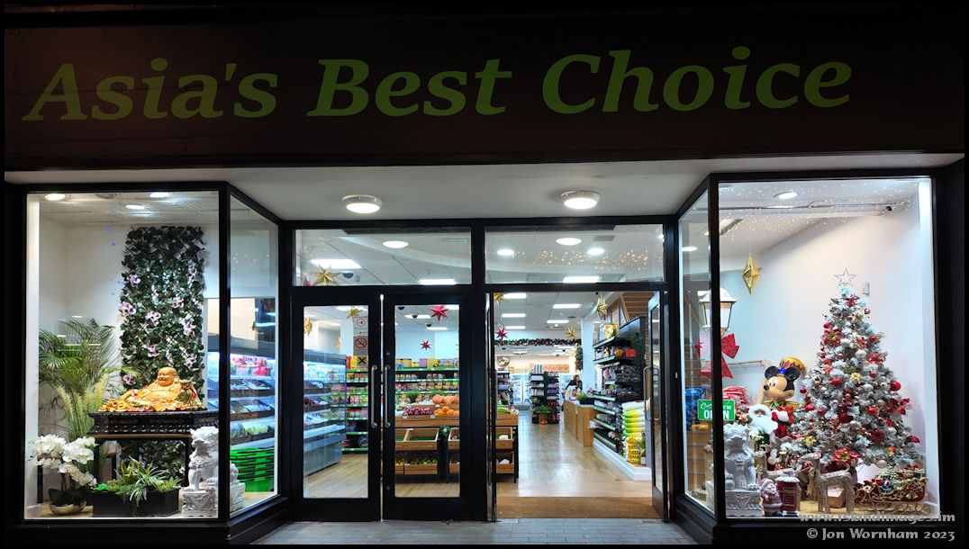 Asian grocery shop window. I love the Buddha in one window and Christmas tree in the other!