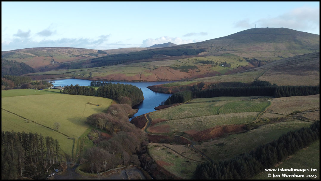 The Druidale stream drains into Sulby Reservoir with Snaefell rising on the right and the North Barrule ridgeline in the distance.