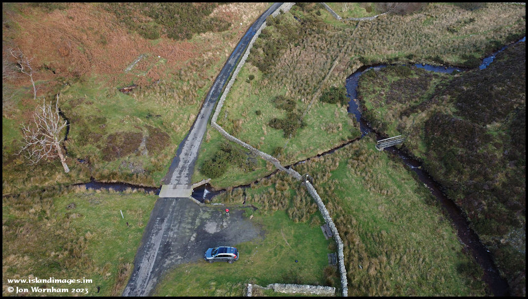 Looking straight down to where the Druidale stream curves through ninety degrees from north to east and the subsidiary stream from Slieau Freoaghan joins it. I suspect there may have been a ford here once, but the water now goes under the road.