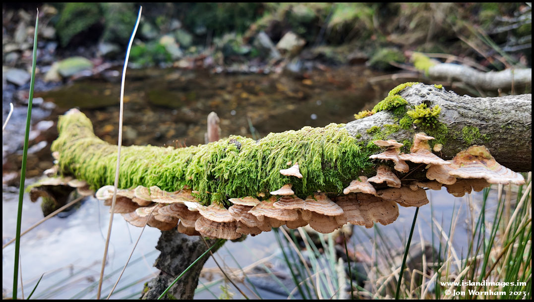 A nice collection of bracket fungi on a moss covered branch.
