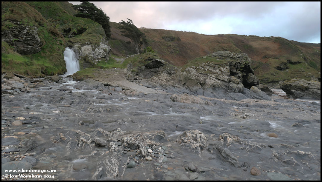 The waterfall at the back of the beach. To get to a better viewpoint I would have had to remove boots and socks to paddle across the river, but I had an alternative solution!