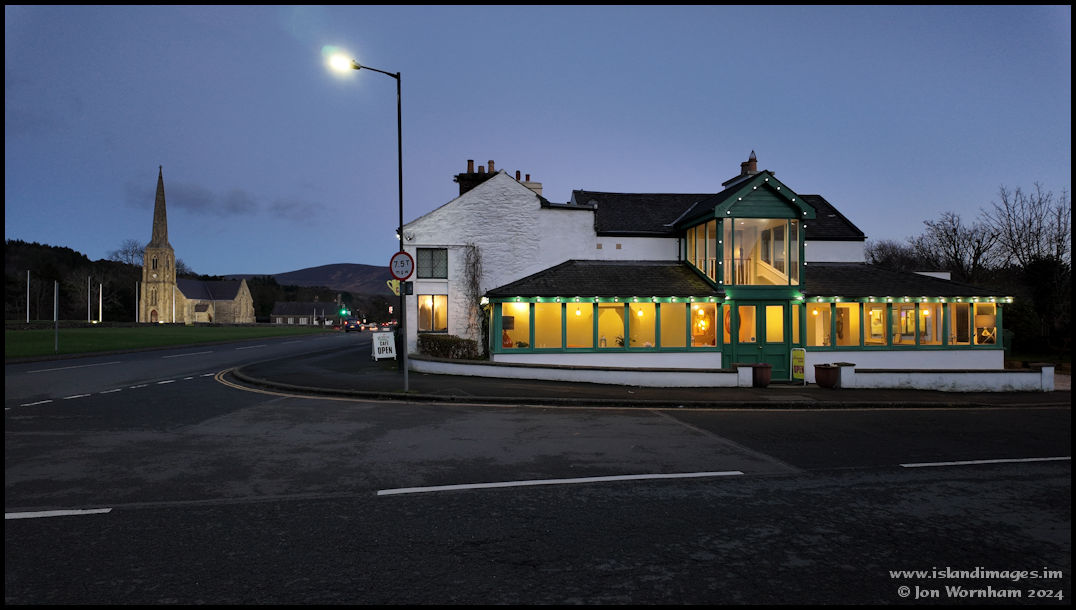 Greens Cafe, with St John's Church. The cafe looked empty as it was approaching closing time. It's now around 30 minutes after official sunset. (P3)