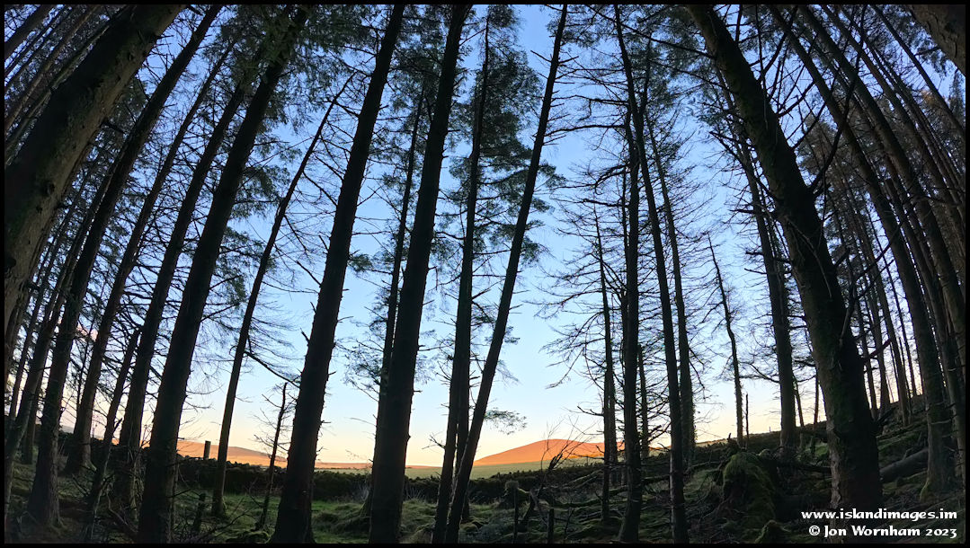 Allowing the 'fisheye' effect of the camera lens (the camera can also correct this, to a certain degree) for this look through the trees to a sunlit Greeba in the distance.