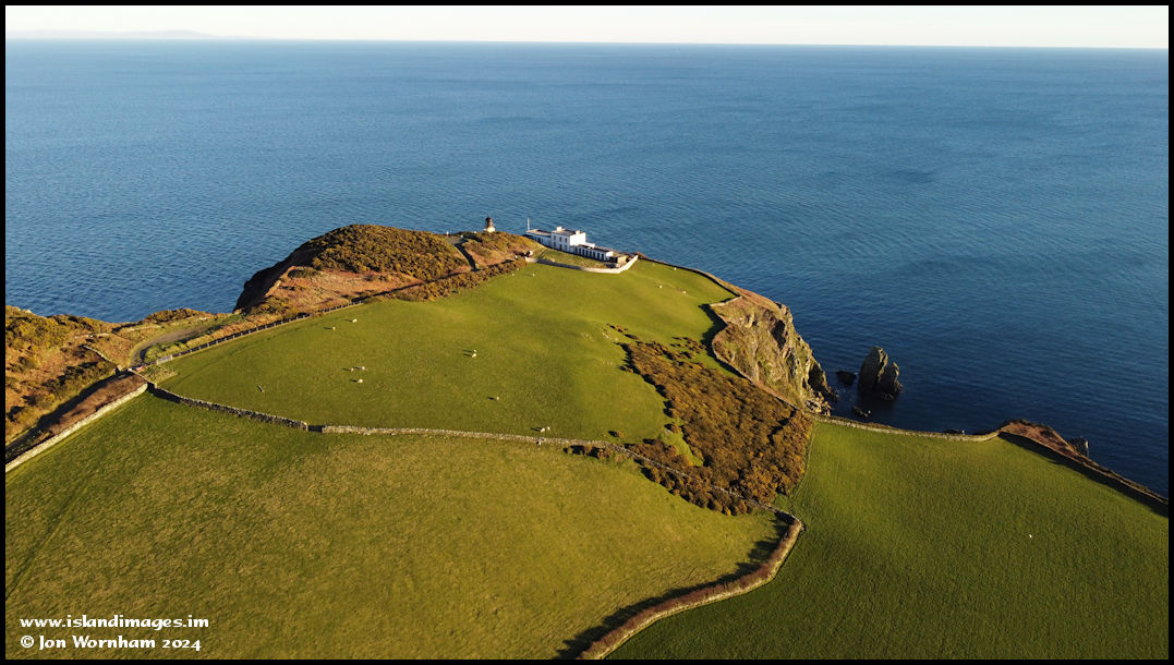 Looking across the fields to where Maughold Head lighthouse is almost hidden behind the landscape, although the former lighthouse keepers cottages show up well.