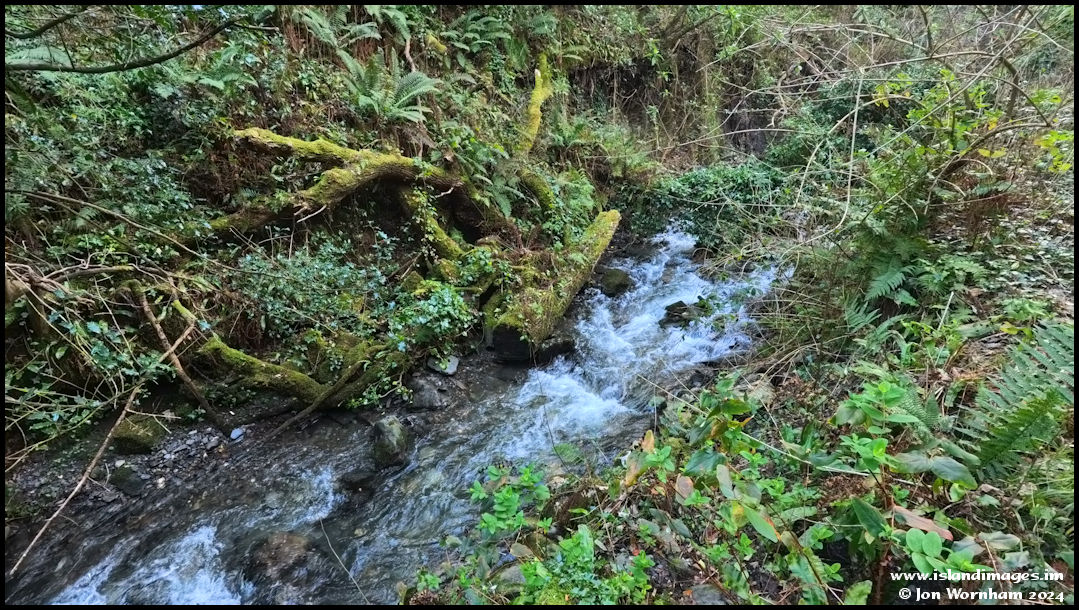 Walking down the glen towards the sea, with dense vegetation around the stream.