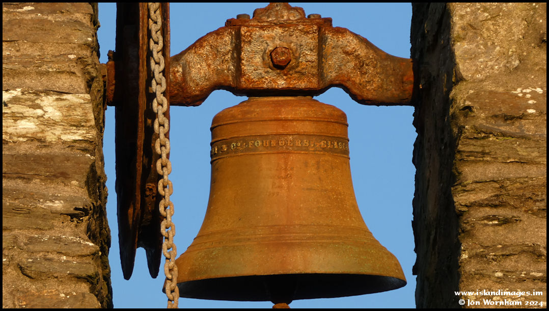 A close-up of the bell reveals that it was originally cast by a foundary in Glasgow, but engraving underneath (and hardly visible here) shows that Earnie Leece, blacksmith of Peel, worked on it in 1999.