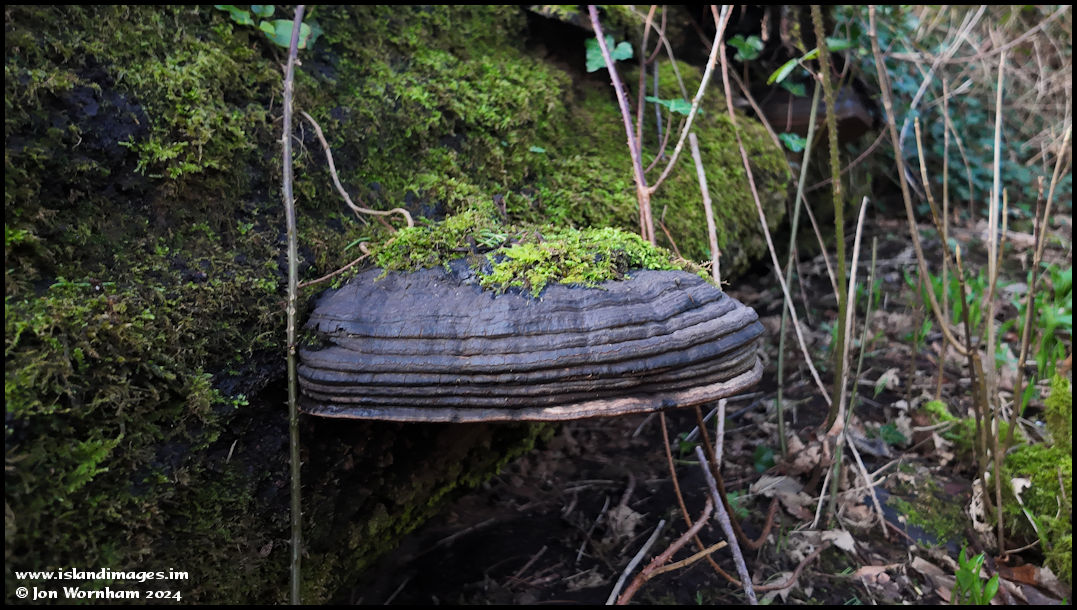 A huge bracket fungus growing from a fallen moss covered tree.
