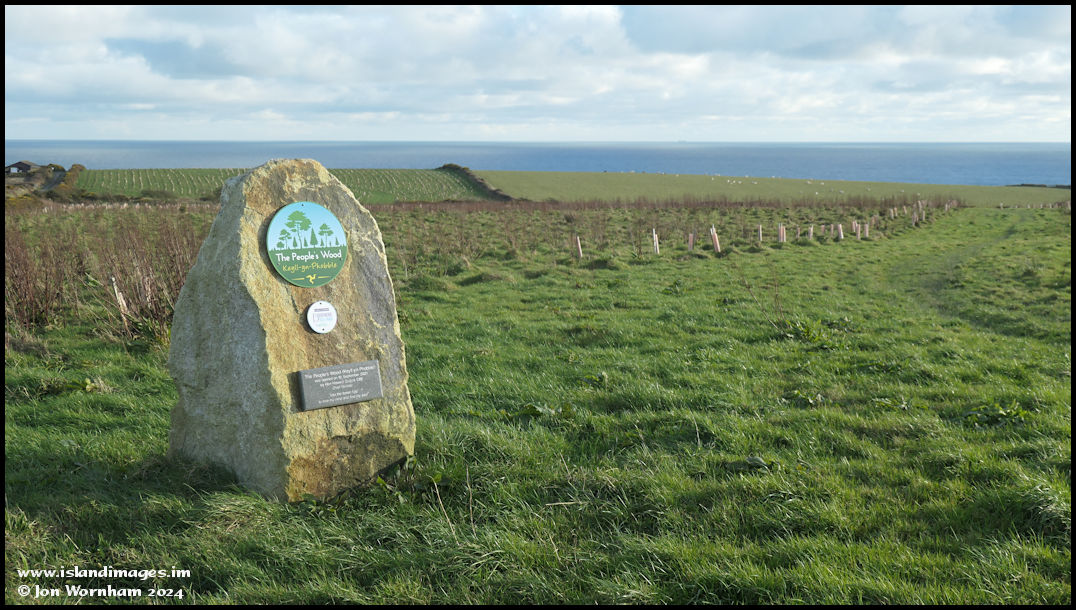 Marker stone for the People's Wood, which slightly confusingly seems to be located in the middle of the planted area. It was officially opened by the Chief Minister on 10th September 2021 but has had little publicity since.