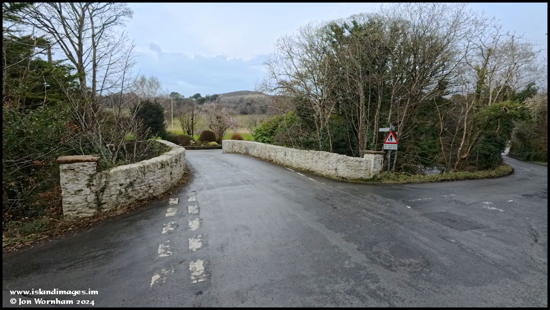 At the River Neb bridge, dated 1820. Three choices of direction, to the right is the Tynwald Mills shopping area, straight ahead leads to the Poortown and Peel road, but I'm going left towards the Brack-a-Broom lane.