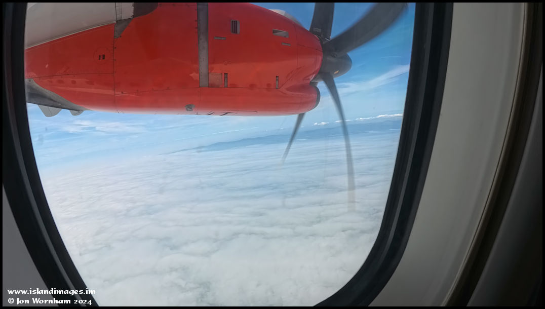 View from the window of the Loganair ATR72 in the hold at 'KELLY'. Cruising well above the fog level with the island visible in the distance.