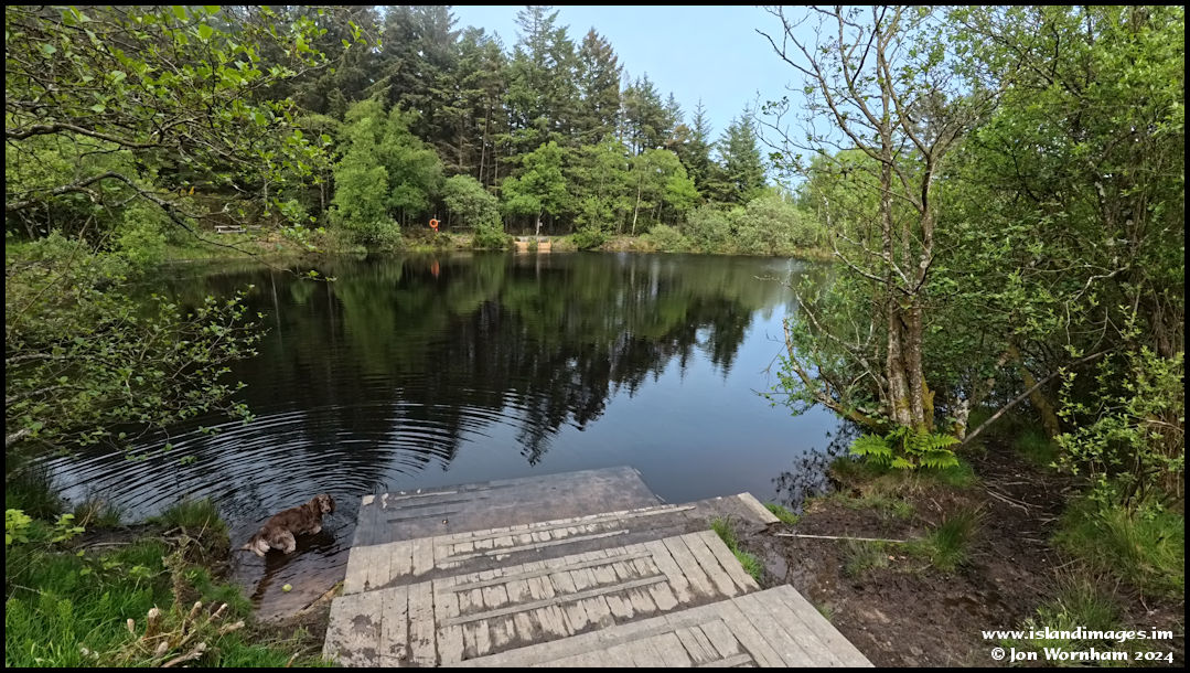 The man made lake in the plantation. From the eastern side the River Dhoo originates, ending up running into the sea at Douglas, and from the other end a stream that ends up in the River Neb, flowing out to see at Peel.