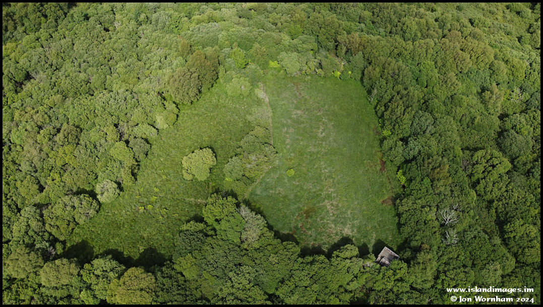 A near vertical view where some of the naturally growing vegetation was cleared some years ago by volunteers to leave an open area of wetlands. There's a bird hide and observation platform at the edge.