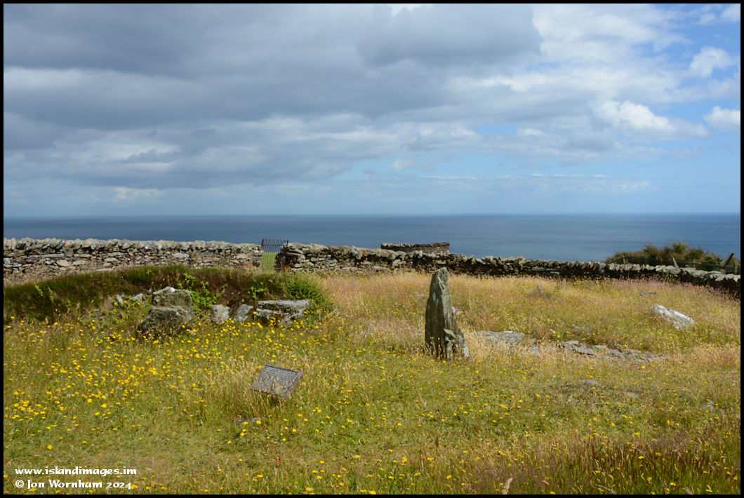 Looking across the Neolithic burial site at Ballafayle towards the sea. The site was discovered more of less by accident in 1936 during work to improve the neighbouring Quaker burial ground.
