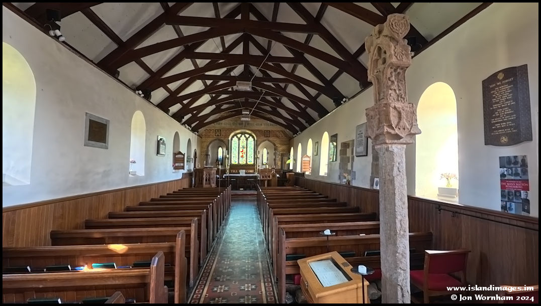 Maughold church interior. The cross on the right dates from the 1300s and is made of sandstone from St Bee's, Cumbria, although the top section is missing.