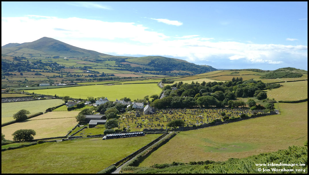 Looking down to Maughold Village. The churchyard wall encloses the area of an early Christian monastery, operational between around 500 - 600 AD, until it moved to England in 1299.