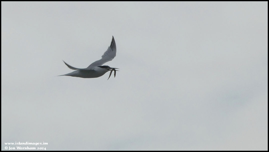 A Tern flies past with a sandeel in its beak.