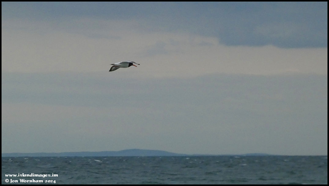 An Oystercatcher over the sea, with a hazy line of Scottish Mountains in the distance.