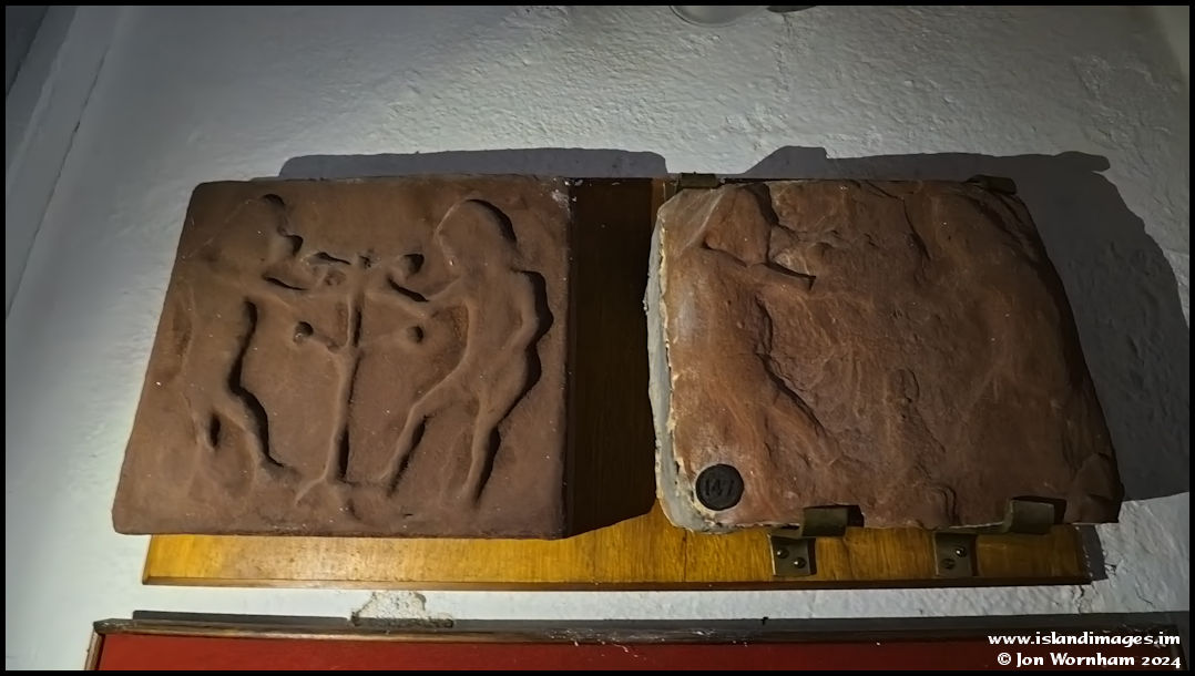 The 'Adam and Eve' stone, dating from the 11th or 12th century. Another stone which was discovered during the demolition of the old church. It has suffered much erosion, the cast on the left was taken from it in the early 1900s