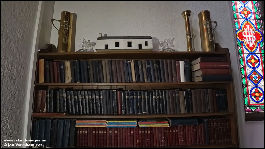 A fine collection of hymn and prayer books and I'm guessing a model of the old church.